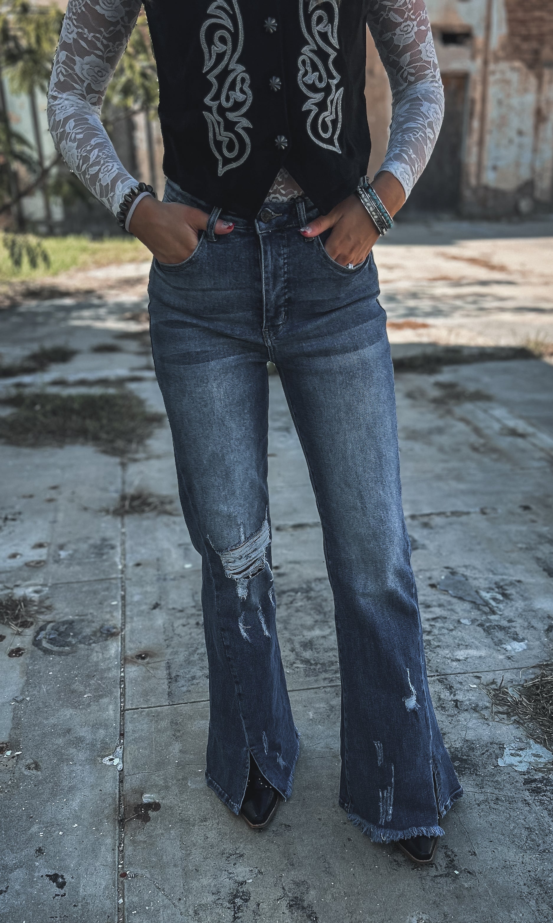 Turn heads in these dark wash flare jeans that bring just the right mix of edge and effortless style. Designed with distressed knees and raw slit hems, they deliver a bold look that pairs perfectly with boots, heels, or sneakers. The 33.5” inseam gives you that long, leggy silhouette, while the flare cut keeps things timeless with a modern twist.